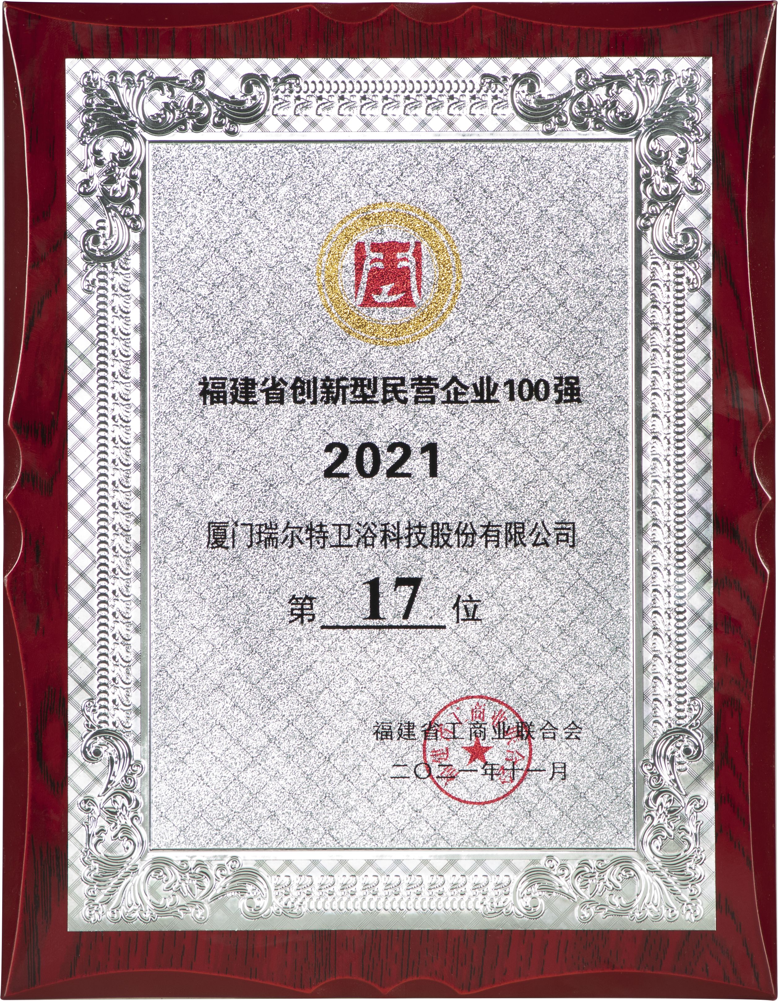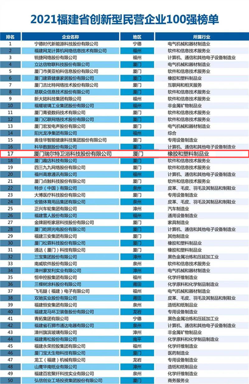 近日,福建省工商業(yè)聯(lián)合會首次發(fā)布2021福建省創(chuàng)新型民營企業(yè)100強榜單,廈門瑞爾特衛(wèi)浴科技股份有限公司憑借創(chuàng)新優(yōu)勢強勢上榜,位列第17位。